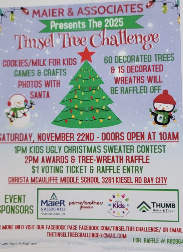 The Tinsel Tree Challenge is Saturday, November 22nd and doors open at 10am. At 1pm there will be a kids ugly Christmas sweater contest, at 2pm awards and tree/wreath raffle. Event is held at Christa McAuliffe Middle School, 3281 Kiesel Rd, Bay City, MI. For more information go to https://www.facebook.com/tinseltreechallenge