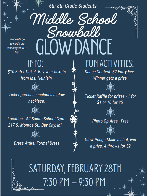Middle School dance for 6th – 8th graders. See Ms. Heinlein to purchase tickets.